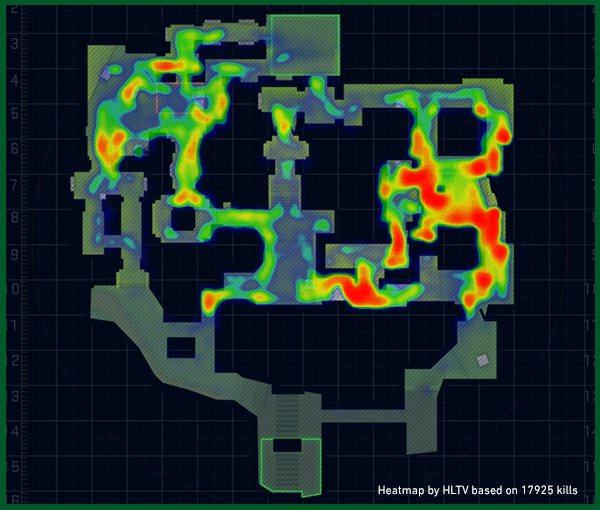 We will never know the true reason for its selection; however, what cannot be debated is how the heatmap (which tracks the movement of players) for Ancient looks quite different to every other map. According to the heatmap, since its arrival at the professional level, there are approximately 10 locations on the map which have a high concentration of Terrorist deaths − a marked increase when compared to others in the competitive map pool and definitely more when contrasted against Train.